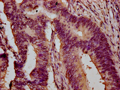 IHC image of CSB-PA010418OA23nbutHU diluted at 1:20 and staining in paraffin-embedded human colon cancer performed on a Leica BondTM system. After dewaxing and hydration, antigen retrieval was mediated by high pressure in a citrate buffer (pH 6.0). Section was blocked with 10% normal goat serum 30min at RT. Then primary antibody (1% BSA) was incubated at 4°C overnight. The primary is detected by a biotinylated secondary antibody and visualized using an HRP conjugated SP system.