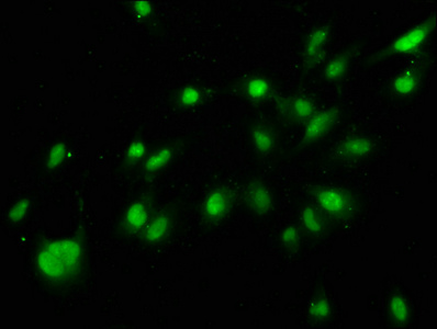 Immunofluorescence staining of Hela cells with CSB-PA010418OA56nhibHU at 1:1, counter-stained with DAPI. The cells were fixed in 4% formaldehyde, permeabilized using 0.2% Triton X-100 and blocked in 10% normal Goat Serum. The cells were then incubated with the antibody overnight at 4°C. The secondary antibody was Alexa Fluor 488-congugated AffiniPure Goat Anti-Rabbit IgG(H+L).