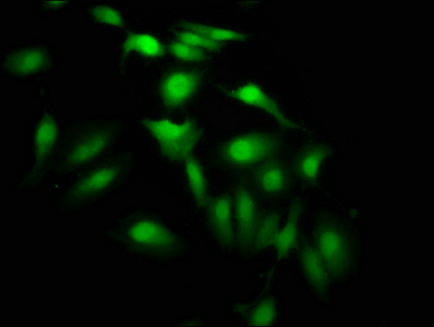 Immunofluorescence staining of Hela cells with CSB-PA010418OA64nme1HU at 1:7.5, counter-stained with DAPI. The cells were fixed in 4% formaldehyde, permeabilized using 0.2% Triton X-100 and blocked in 10% normal Goat Serum. The cells were then incubated with the antibody overnight at 4°C. The secondary antibody was Alexa Fluor 488-congugated AffiniPure Goat Anti-Rabbit IgG(H+L).