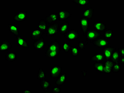 Immunofluorescence staining of Hela cells with CSB-PA010429OA31nbhbHU at 1:25, counter-stained with DAPI. The cells were fixed in 4% formaldehyde, permeabilized using 0.2% Triton X-100 and blocked in 10% normal Goat Serum. The cells were then incubated with the antibody overnight at 4°C. The secondary antibody was Alexa Fluor 488-congugated AffiniPure Goat Anti-Rabbit IgG(H+L).