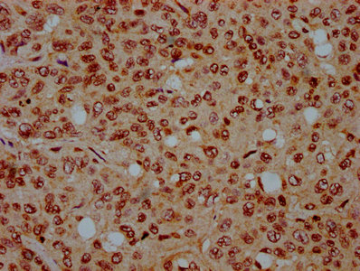 IHC image of CSB-PA010429OA44nbutHU diluted at 1:15 and staining in paraffin-embedded human liver cancer performed on a Leica BondTM system. After dewaxing and hydration, antigen retrieval was mediated by high pressure in a citrate buffer (pH 6.0). Section was blocked with 10% normal goat serum 30min at RT. Then primary antibody (1% BSA) was incubated at 4°C overnight. The primary is detected by a biotinylated secondary antibody and visualized using an HRP conjugated SP system.
