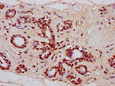 IHC image of CSB-PA010429OA77nbutHU diluted at 1:20 and staining in paraffin-embedded human breast cancer performed on a Leica BondTM system. After dewaxing and hydration, antigen retrieval was mediated by high pressure in a citrate buffer (pH 6.0). Section was blocked with 10% normal goat serum 30min at RT. Then primary antibody (1% BSA) was incubated at 4°C overnight. The primary is detected by a biotinylated secondary antibody and visualized using an HRP conjugated SP system.