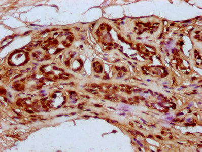 IHC image of CSB-PA010429OA79npropHU diluted at 1:20 and staining in paraffin-embedded human breast cancer performed on a Leica BondTM system. After dewaxing and hydration, antigen retrieval was mediated by high pressure in a citrate buffer (pH 6.0). Section was blocked with 10% normal goat serum 30min at RT. Then primary antibody (1% BSA) was incubated at 4°C overnight. The primary is detected by a biotinylated secondary antibody and visualized using an HRP conjugated SP system.
