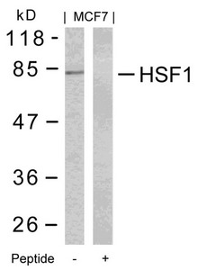 Western blot analysis of extracts from MCF7 cells using HSF1(Ab-303) Antibody and the same antibody preincubated with blocking peptide.