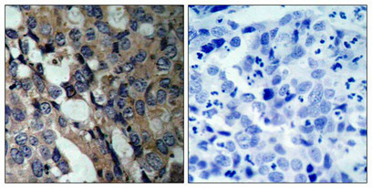 Immunohistochemical analysis of paraffin-embedded human breast carcinoma tissue using HSP27(Ab-15) Antibody(left) or the same antibody preincubated with blocking peptide(right).