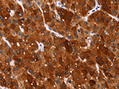 The image on the left is immunohistochemistry of paraffin-embedded Human liver cancer tissue using CSB-PA780646(HSPB6 Antibody) at dilution 1/40, on the right is treated with synthetic peptide. (Original magnification: ×200)