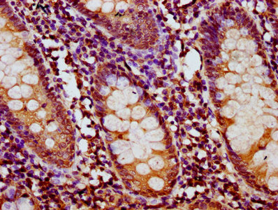 IHC image of CSB-PA719395LA01HU diluted at 1:400 and staining in paraffin-embedded human appendix tissue performed on a Leica BondTM system. After dewaxing and hydration, antigen retrieval was mediated by high pressure in a citrate buffer (pH 6.0). Section was blocked with 10% normal goat serum 30min at RT. Then primary antibody (1% BSA) was incubated at 4°C overnight. The primary is detected by a biotinylated secondary antibody and visualized using an HRP conjugated SP system.