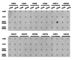 免疫原:A synthetic methylated peptide corresponding to residues surrounding Arg17 of Human histone H3