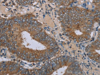 The image on the left is immunohistochemistry of paraffin-embedded Human colon cancer tissue using CSB-PA286863(IFRD1 Antibody) at dilution 1/30, on the right is treated with fusion protein. (Original magnification: ×200)
