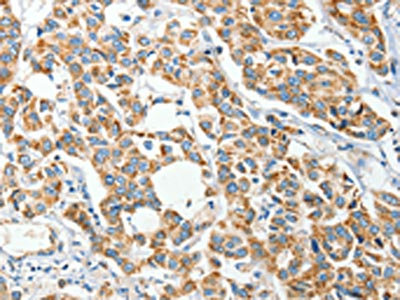 The image on the left is immunohistochemistry of paraffin-embedded Human liver cancer tissue using CSB-PA040376(IFT74 Antibody) at dilution 1/60, on the right is treated with synthetic peptide. (Original magnification: ×200)
