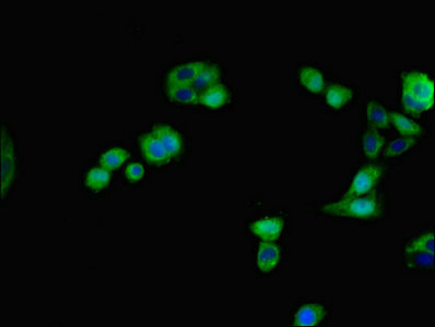 Immunofluorescent analysis of HepG2 cells using CSB-PA622779LA01HU at dilution of 1:100 and Alexa Fluor 488-congugated AffiniPure Goat Anti-Rabbit IgG(H+L)