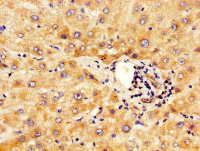 IHC image of CSB-PA622779LA01HU diluted at 1:500 and staining in paraffin-embedded human liver tissue performed on a Leica BondTM system. After dewaxing and hydration, antigen retrieval was mediated by high pressure in a citrate buffer (pH 6.0). Section was blocked with 10% normal goat serum 30min at RT. Then primary antibody (1% BSA) was incubated at 4°C overnight. The primary is detected by a biotinylated secondary antibody and visualized using an HRP conjugated SP system.
