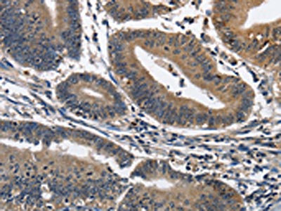 The image on the left is immunohistochemistry of paraffin-embedded Human colon cancer tissue using CSB-PA114100(IL2RB Antibody) at dilution 1/60, on the right is treated with fusion protein. (Original magnification: ×200)