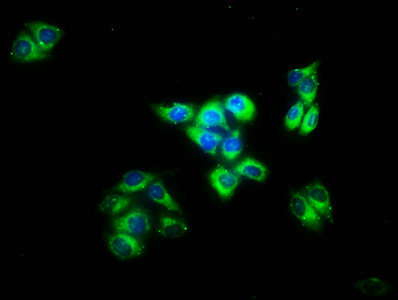 Immunofluorescence staining of Hela cells with CSB-PA011704LA01HU at 1:133, counter-stained with DAPI. The cells were fixed in 4% formaldehyde, permeabilized using 0.2% Triton X-100 and blocked in 10% normal Goat Serum. The cells were then incubated with the antibody overnight at 4°C. The secondary antibody was Alexa Fluor 488-congugated AffiniPure Goat Anti-Rabbit IgG(H+L).
