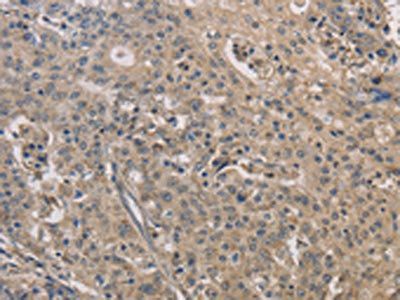 The image on the left is immunohistochemistry of paraffin-embedded Human liver cancer tissue using CSB-PA793788(IRAK4 Antibody) at dilution 1/40, on the right is treated with fusion protein. (Original magnification: ×200)