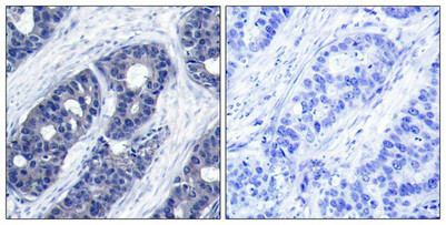 Immunohistochemical analysis of paraffin-embedded human breast carcinoma tissue using IRS-1(Ab-636) Antibody(left) or the same antibody preincubated with blocking peptide(right).
