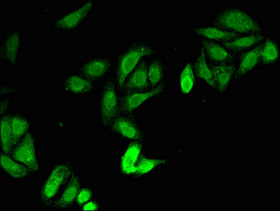 Immunofluorescent analysis of HepG2 cells using CSB-PA01949A0Rb at dilution of 1:100 and Alexa Fluor 488-congugated AffiniPure Goat Anti-Rabbit IgG(H+L)