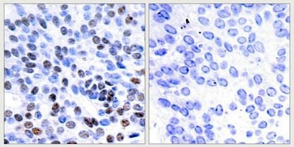 Immunohistochemical analysis of paraffin-embedded human breast carcinoma tissue using JunB(Ab-259) Antibody(left) or the same antibody preincubated with blocking peptide(right).