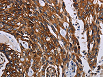 The image on the left is immunohistochemistry of paraffin-embedded Human colon cancer tissue using CSB-PA163096(KARS Antibody) at dilution 1/60, on the right is treated with fusion protein. (Original magnification: ×200)