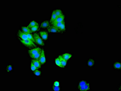 Immunofluorescent analysis of HepG2 cells using CSB-PA012045LA01HU at dilution of 1:100 and Alexa Fluor 488-congugated AffiniPure Goat Anti-Rabbit IgG(H+L)