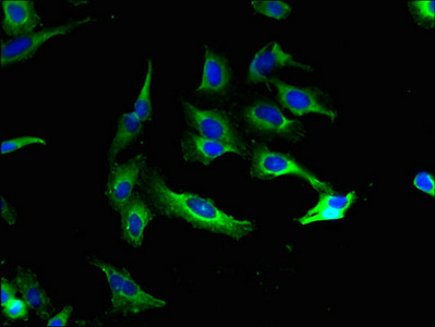Immunofluorescent analysis of Hela cells using CSB-PA614255LA01HU at dilution of 1:100 and Alexa Fluor 488-congugated AffiniPure Goat Anti-Rabbit IgG(H+L)