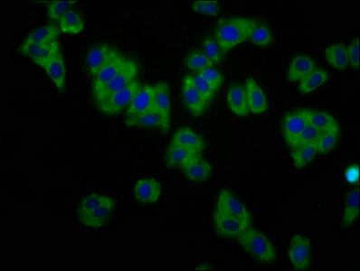 Immunofluorescence staining of HepG2 cells with CSB-PA686387LA01HU at 1:133, counter-stained with DAPI. The cells were fixed in 4% formaldehyde, permeabilized using 0.2% Triton X-100 and blocked in 10% normal Goat Serum. The cells were then incubated with the antibody overnight at 4°C. The secondary antibody was Alexa Fluor 488-congugated AffiniPure Goat Anti-Rabbit IgG(H+L).