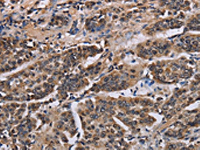The image on the left is immunohistochemistry of paraffin-embedded Human breast cancer tissue using CSB-PA197107(KIF2A Antibody) at dilution 1/30, on the right is treated with fusion protein. (Original magnification: ×200)
