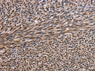 The image on the left is immunohistochemistry of paraffin-embedded Human sarcoma tissue using CSB-PA197107(KIF2A Antibody) at dilution 1/30, on the right is treated with fusion protein. (Original magnification: ×200)