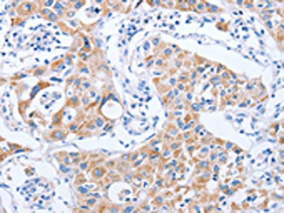 The image on the left is immunohistochemistry of paraffin-embedded Human lung cancer tissue using CSB-PA236618(KIF3A Antibody) at dilution 1/25, on the right is treated with fusion protein. (Original magnification: ×200)