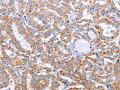 The image on the left is immunohistochemistry of paraffin-embedded Human thyroid cancer tissue using CSB-PA236618(KIF3A Antibody) at dilution 1/25, on the right is treated with fusion protein. (Original magnification: ×200)