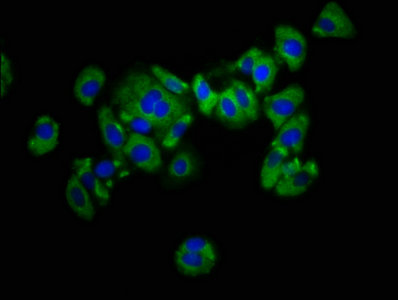 Immunofluorescence staining of HepG2 cells with CSB-PA012352LA01HU at 1:133, counter-stained with DAPI. The cells were fixed in 4% formaldehyde, permeabilized using 0.2% Triton X-100 and blocked in 10% normal Goat Serum. The cells were then incubated with the antibody overnight at 4°C. The secondary antibody was Alexa Fluor 488-congugated AffiniPure Goat Anti-Rabbit IgG(H+L).