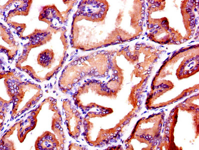 IHC image of CSB-PA06779A0Rb diluted at 1:600 and staining in paraffin-embedded human prostate tissue performed on a Leica BondTM system. After dewaxing and hydration, antigen retrieval was mediated by high pressure in a citrate buffer (pH 6.0). Section was blocked with 10% normal goat serum 30min at RT. Then primary antibody (1% BSA) was incubated at 4°C overnight. The primary is detected by a biotinylated secondary antibody and visualized using an HRP conjugated SP system.
