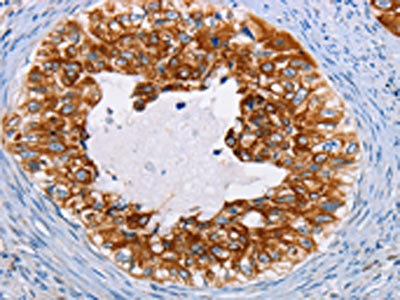 The image on the left is immunohistochemistry of paraffin-embedded Human cervical cancer tissue using CSB-PA297945(KRT13 Antibody) at dilution 1/35, on the right is treated with fusion protein. (Original magnification: ×200)
