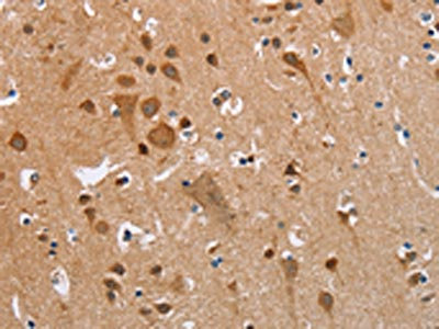 The image on the left is immunohistochemistry of paraffin-embedded Human brain tissue using CSB-PA297945(KRT13 Antibody) at dilution 1/35, on the right is treated with fusion protein. (Original magnification: ×200)