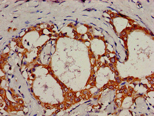IHC image of CSB-PA10629A0Rb diluted at 1:800 and staining in paraffin-embedded human breast cancer performed on a Leica BondTM system. After dewaxing and hydration, antigen retrieval was mediated by high pressure in a citrate buffer (pH 6.0). Section was blocked with 10% normal goat serum 30min at RT. Then primary antibody (1% BSA) was incubated at 4°C overnight. The primary is detected by a biotinylated secondary antibody and visualized using an HRP conjugated SP system.