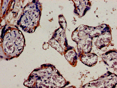 Immunocytochemistry analysis of human placenta tissue using CSB-PA10629A0Rb at dilution of 1:100