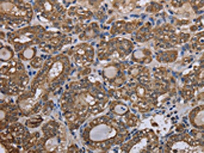 The image on the left is immunohistochemistry of paraffin-embedded Human thyroid cancer tissue using CSB-PA438776(KRT31 Antibody) at dilution 1/20, on the right is treated with fusion protein. (Original magnification: ×200)