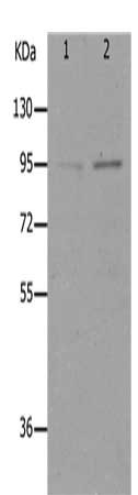 Gel: 10%SDS-PAGE, Lysate: 40 μg, Lane 1-2: HT29 cells, K562 cells, Primary antibody: CSB-PA914116(LEPR Antibody) at dilution 1/400, Secondary antibody: Goat anti rabbit IgG at 1/8000 dilution, Exposure time: 1 minute