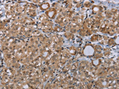 The image on the left is immunohistochemistry of paraffin-embedded Human thyroid cancer tissue using CSB-PA782037(LIMK1 Antibody) at dilution 1/40, on the right is treated with synthetic peptide. (Original magnification: ×200)
