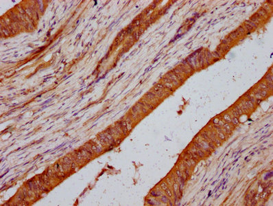 IHC image of CSB-PA823897LA01HU diluted at 1:200 and staining in paraffin-embedded human colon cancer performed on a Leica BondTM system. After dewaxing and hydration, antigen retrieval was mediated by high pressure in a citrate buffer (pH 6.0). Section was blocked with 10% normal goat serum 30min at RT. Then primary antibody (1% BSA) was incubated at 4°C overnight. The primary is detected by a biotinylated secondary antibody and visualized using an HRP conjugated SP system.