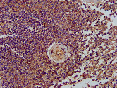 IHC image of CSB-PA013105LA01HU diluted at 1:400 and staining in paraffin-embedded human spleen tissue performed on a Leica BondTM system. After dewaxing and hydration, antigen retrieval was mediated by high pressure in a citrate buffer (pH 6.0). Section was blocked with 10% normal goat serum 30min at RT. Then primary antibody (1% BSA) was incubated at 4°C overnight. The primary is detected by a biotinylated secondary antibody and visualized using an HRP conjugated SP system.