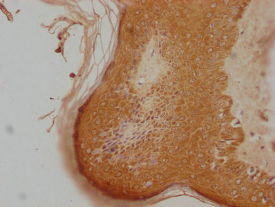 IHC image of CSB-PA408988LA01HU diluted at 1:100 and staining in paraffin-embedded human skin tissue performed on a Leica BondTM system. After dewaxing and hydration, antigen retrieval was mediated by high pressure in a citrate buffer (pH 6.0). Section was blocked with 10% normal goat serum 30min at RT. Then primary antibody (1% BSA) was incubated at 4°C overnight. The primary is detected by a biotinylated secondary antibody and visualized using an HRP conjugated SP system.