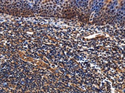 The image on the left is immunohistochemistry of paraffin-embedded Human tonsil tissue using CSB-PA014309(LRRC57 Antibody) at dilution 1/40, on the right is treated with fusion protein. (Original magnification: ×200)