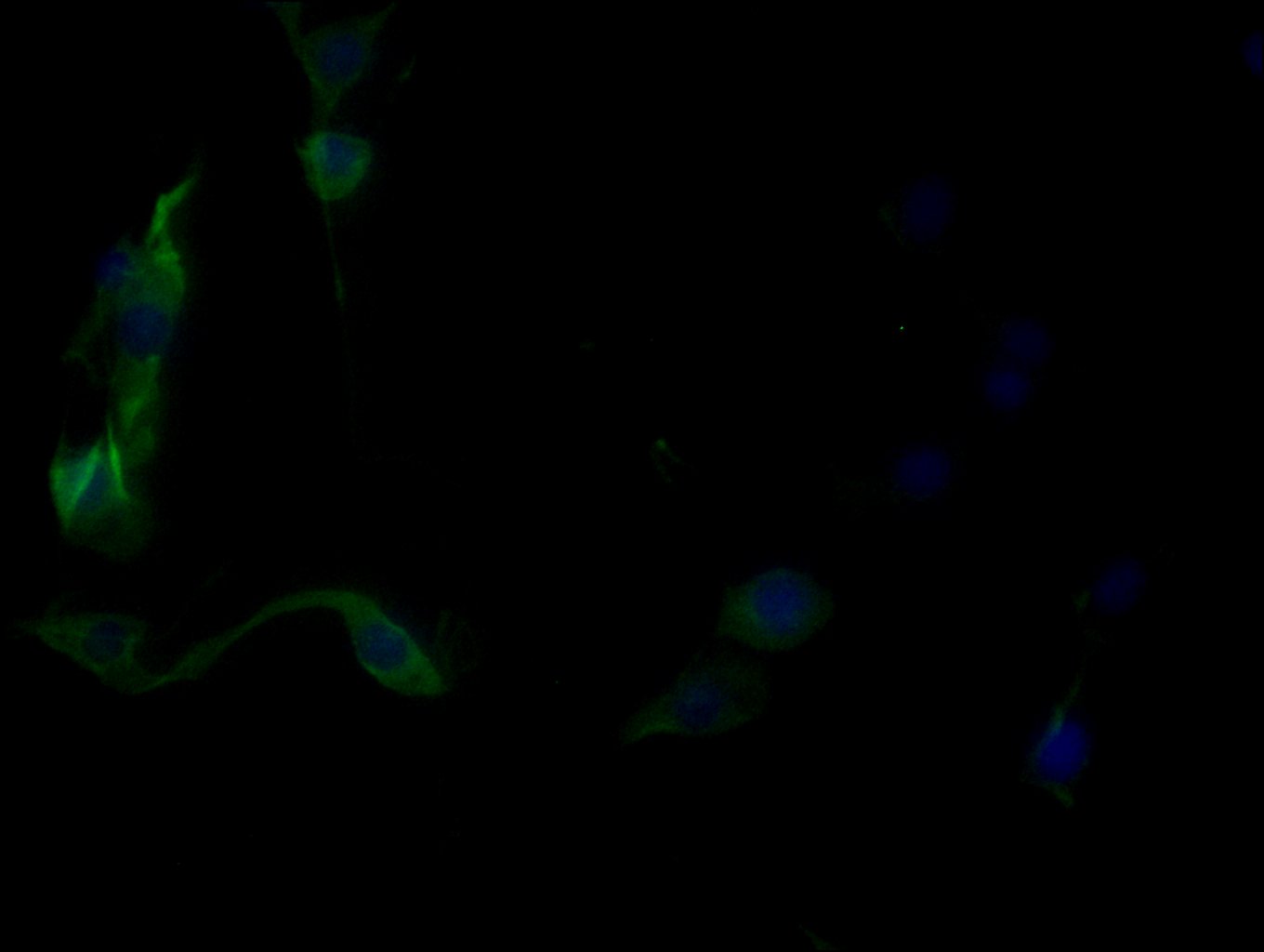 Immunofluorescence staining of MCF-7 cell with CSB-PA880968LA01HU at 1:25, counter-stained with DAPI. The cells were fixed in 4% formaldehyde and blocked in 10% normal Goat Serum.The cells were then incubated with the antibody overnight at 4°C. The secondary antibody was Alexa Fluor 488-congugated AffiniPure Goat Anti-Rabbit IgG(H+L).