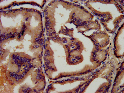 IHC image of CSB-PA00870E0Rb diluted at 1:450 and staining in paraffin-embedded human prostate tissue performed on a Leica BondTM system. After dewaxing and hydration, antigen retrieval was mediated by high pressure in a citrate buffer (pH 6.0). Section was blocked with 10% normal goat serum 30min at RT. Then primary antibody (1% BSA) was incubated at 4°C overnight. The primary is detected by a biotinylated secondary antibody and visualized using an HRP conjugated SP system.
