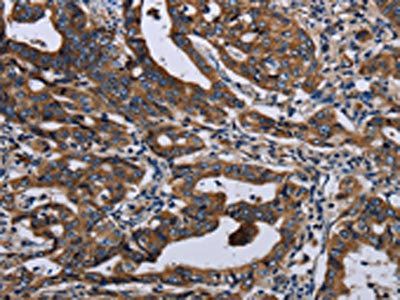 The image on the left is immunohistochemistry of paraffin-embedded Human gastic cancer tissue using CSB-PA217118(LZTFL1 Antibody) at dilution 1/50, on the right is treated with fusion protein. (Original magnification: ×200)