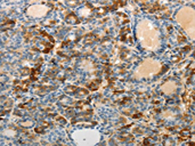 The image on the left is immunohistochemistry of paraffin-embedded Human thyroid cancer tissue using CSB-PA209741(MAD2L1 Antibody) at dilution 1/25, on the right is treated with fusion protein. (Original magnification: ×200)