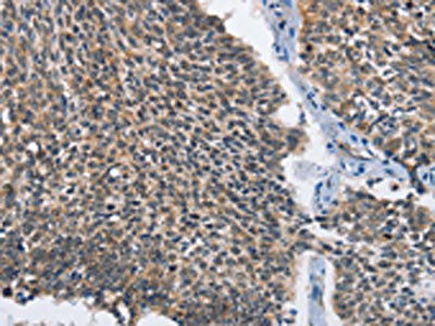 The image on the left is immunohistochemistry of paraffin-embedded Human lung cancer tissue using CSB-PA083591(MAD2L1BP Antibody) at dilution 1/60, on the right is treated with fusion protein. (Original magnification: ×200)