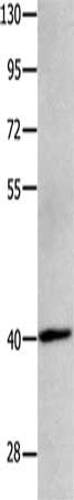 Gel: 10%SDS-PAGE, Lysate: 40 μg, Lane: Human brain glioma tissue, Primary antibody: CSB-PA907852(MAGEB4 Antibody) at dilution 1/550, Secondary antibody: Goat anti rabbit IgG at 1/8000 dilution, Exposure time: 2 minutes