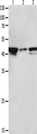 Gel: 10%SDS-PAGE, Lysate: 40 μg, Lane 1-3: Hela cells, NIH/3T3 cells, Jurkat cells, Primary antibody: CSB-PA097880(MAP2K2 Antibody) at dilution 1/1900, Secondary antibody: Goat anti rabbit IgG at 1/8000 dilution, Exposure time: 30 seconds